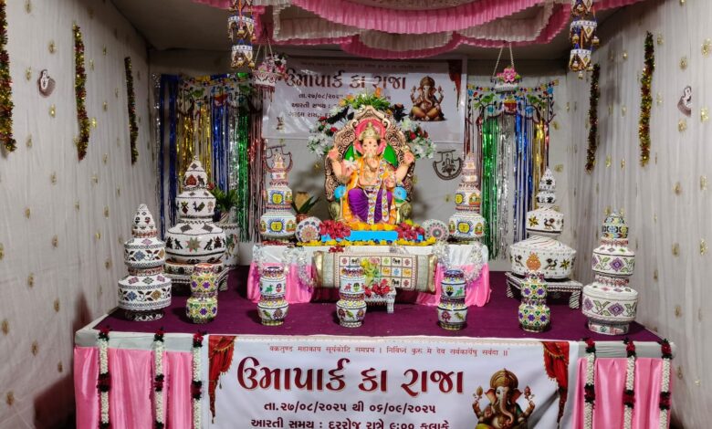 ચારો તરફ અનેરી શ્રધ્ધા,ભાવ અને ભકિત સાથે વિધ્નહર્તા ગજાનંદ ગણપતિ મહારાજનો ગણપતિ ઉત્સવ ઉજવાય રહ્યો છે ત્યારે બ્રાહ્મણ સોસાયટી તથા તેની પાછળ ઉમાપાર્ક ખાતે મોટી સંખ્યામાં કાઠી દરબાર સમાજ વસવાટ કરે છે ત્યાં સમગ્ર ઉમાપાર્ક દ્વારા કાઠી દરબાર સંસ્કૃતિનું જીવંત દર્શન કરાવતાં ભવ્ય ગણપતિ ઉત્સવ ચરિતાર્થ થઈ રહ્યોં છે…દરરોજ 9 થી 12 કલાક સુધી દાદાનો ઉત્સવ ઉજવાય છે…રોજ અવનવા પ્રસાદ ધરાવવામાં આવે છે,અવનવા સાંસ્કૃતિક કાર્યક્રમો, કિર્તન, સુશોભન તેમજ ખાસ આકર્ષણનું કેન્દ્ર ઉમા પાર્કના કાઠી દરબાર સમાજના દીકરીબાઓ દ્વારા કાઠી દરબાર સમાજની આગવી કલા સંસ્કૃતિ અને આવડતના પ્રતિક સમા મોતીકામ,અને ભરતકામના વિવિધ બેનમુન પ્રતિકોથી દાદાનો શણગાર કરવામાં આવે છે… ચાકળા,ચંદરવા,મોતી ભરેલ હેલ,મોતી ભરેલ ગોળી,મોતીના વિઝણા,મટકીઓ,મોતીના તકીયા,ઝુમર,ઓશિકા,ફુલદાનીઓ ,સામૈયા,વગેરે અનેકવિધ કલા પ્રતિકો સૌના આકર્ષણનું કેન્દ્ર બની રહ્યા છે..આમ ઉમા પાર્ક ખાતે કાઠી દરબાર સમાજના બહેનો દ્વારા ઉજવાતો આ ગણપતિ ઉત્સવ ખરા અર્થમાં ભક્તિ,ભજન, શ્રધ્ધા, સમર્પણ અને સંસ્કૃતિનું પ્રતિક બની રહ્યોં છે.